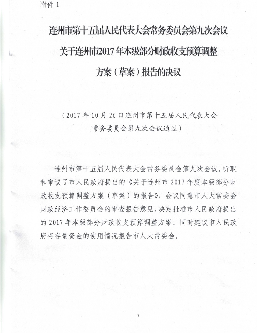我受市人民政府的委托,向市人大常委會(huì)報(bào)告關(guān)于2017年度市本級(jí)部分財(cái)政收支預(yù)算調(diào)整方案的報(bào)告,請(qǐng)予審議。