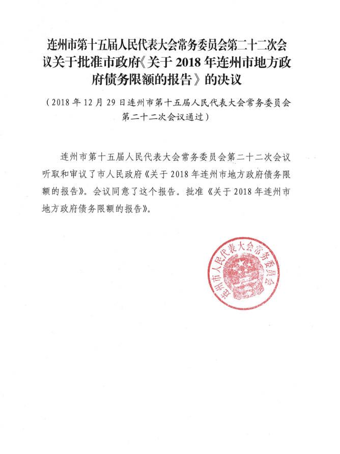 連州市第十五屆人民代表大會常務(wù)委員會第二十二次會議關(guān)于批準(zhǔn)市政府《關(guān)于2018年連州市地方政府債務(wù)限額的報告》的決議