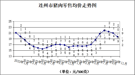 12月份,我市豬肉零售價格持續(xù)下降。農(nóng)貿(mào)市場監(jiān)測的四種主要豬肉零售均價為19.72元/500克,環(huán)比降6.05%。其中,排骨26.24元/500克,環(huán)比降10.26%;精瘦肉21.21元/500克,環(huán)比降3.50%;肋條肉15.71元/500克,環(huán)比降4.09%,有皮上肉15.71元/500克,環(huán)比降4.09%。