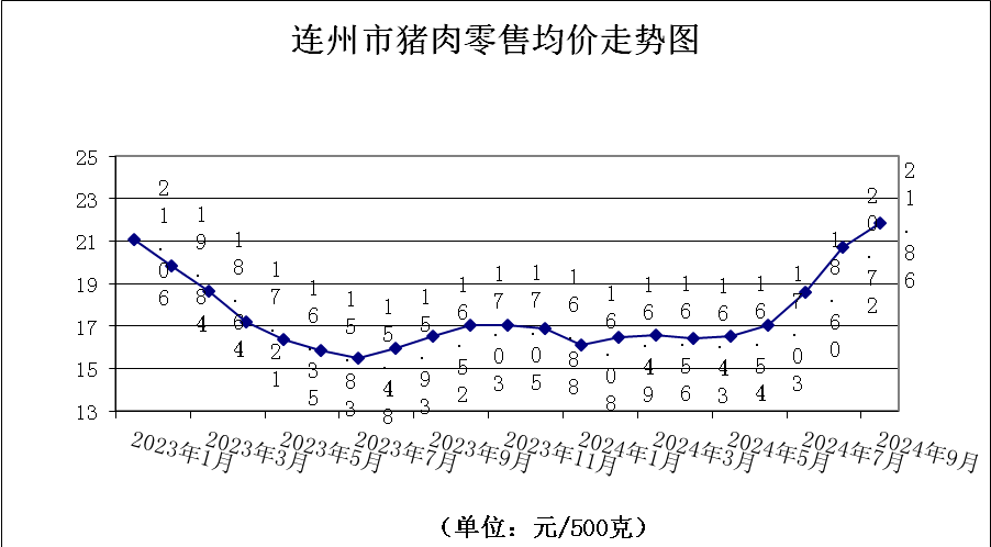 9月份,我市豬肉零售價(jià)格持續(xù)上升,漲幅有所收窄。農(nóng)貿(mào)市場監(jiān)測的四種主要豬肉零售均價(jià)為21.86元/500克,環(huán)比升5.50%。其中,排骨30.92元/500克,環(huán)比升7.77%;精瘦肉21.50元/500克,環(huán)比升1.99%;肋條肉17.50元/500克,環(huán)比升5.68%,有皮上肉17.50元/500克,環(huán)比升5.68%。