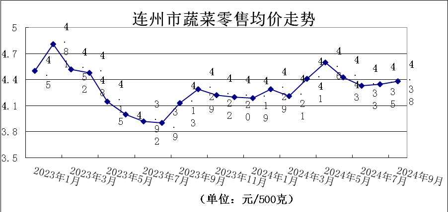9月份,我市蔬菜價(jià)格微升,農(nóng)貿(mào)市場監(jiān)測的30種主要蔬菜零售價(jià)格“15升5平10降”,蔬菜類平均零售價(jià)格為4.38元/500克,環(huán)比升0.69%。其中,葉菜類零售價(jià)格為4.45元/500克,環(huán)比升1.14%,花菜類零售價(jià)格為3.96元/500克,環(huán)比升6.17%,瓜菜類零售價(jià)格為4.20元/500克,環(huán)比降0.24%,根莖類零售價(jià)格為4.65元/500克,環(huán)比降0.21%。